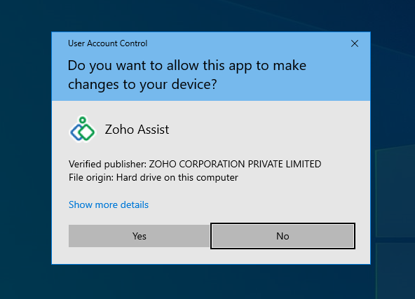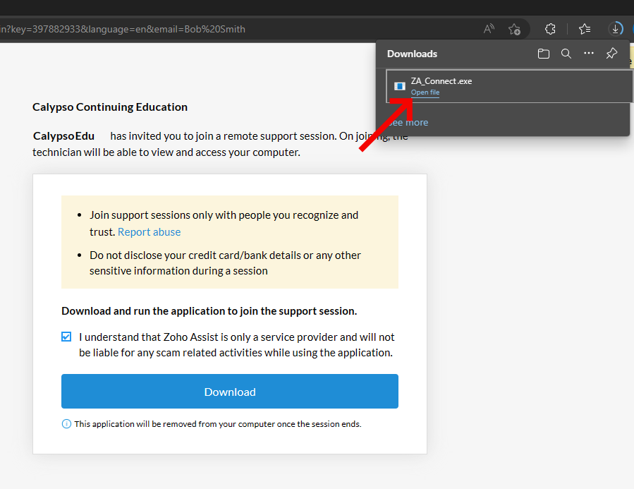 You will then be taken to a download page for the Zoho Assist Application. This is what allows us to connect to you remotely. Please click download and then open the installer.