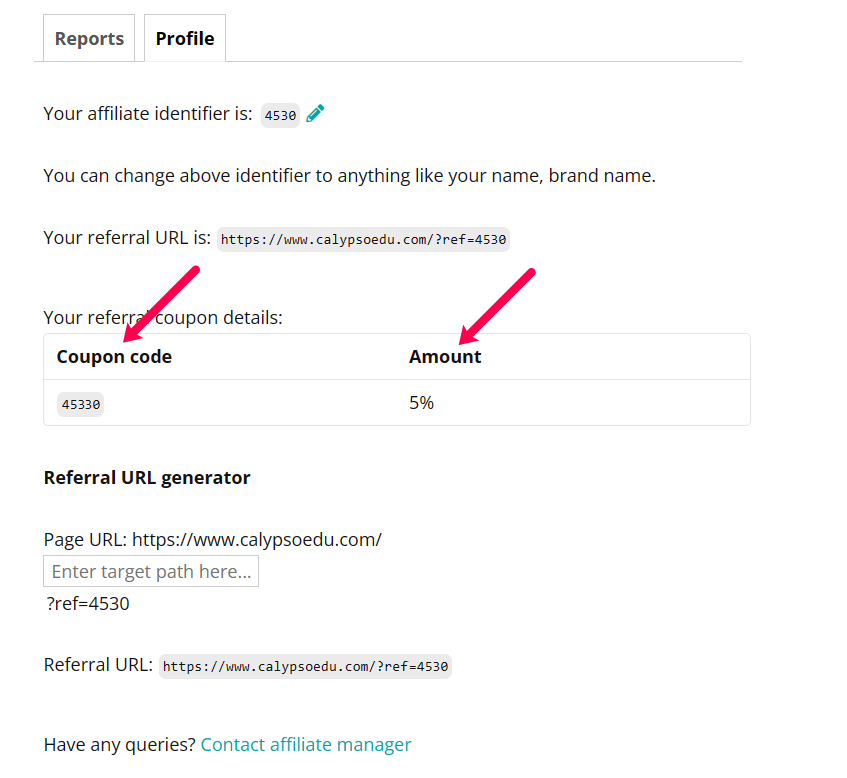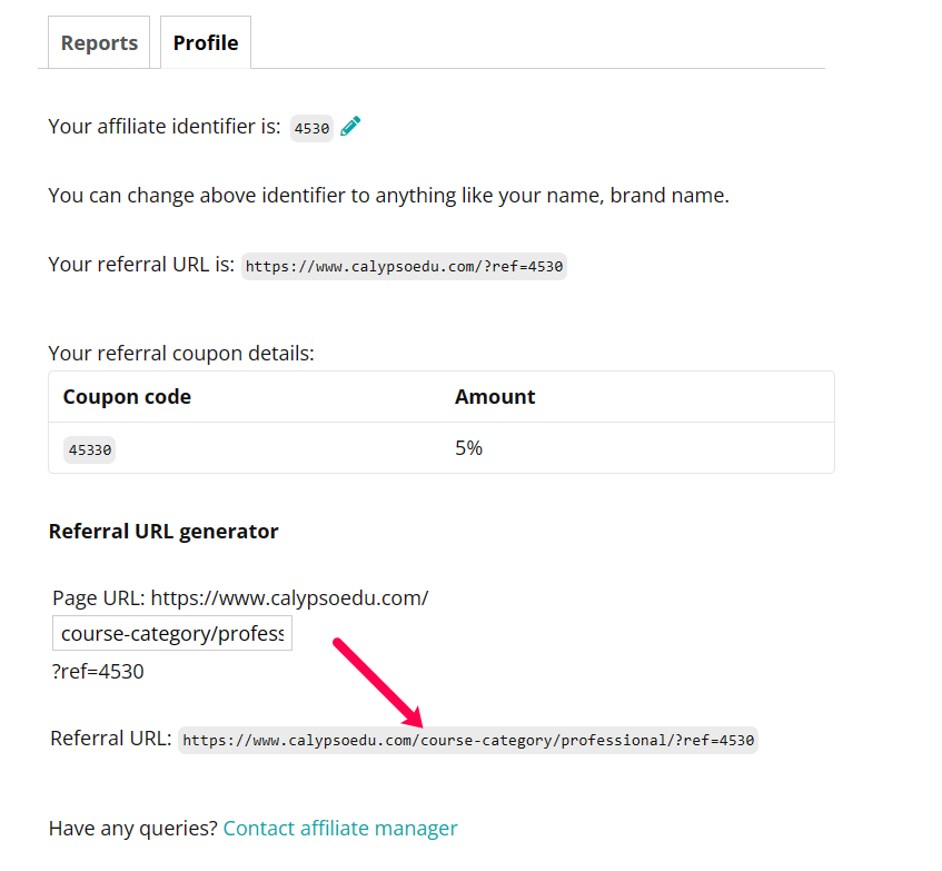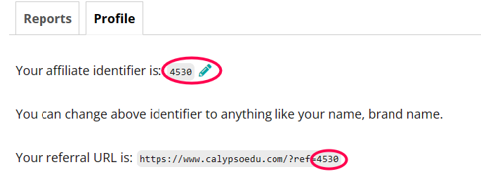 Your affiliate identifier is found at the top of your Affiliate Profile. The identifier is what is displayed on the end of your referral URL.