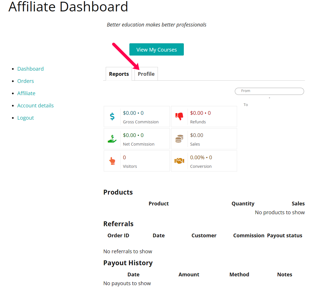 3. Click the Profile tab of your Affiliate Dashboard